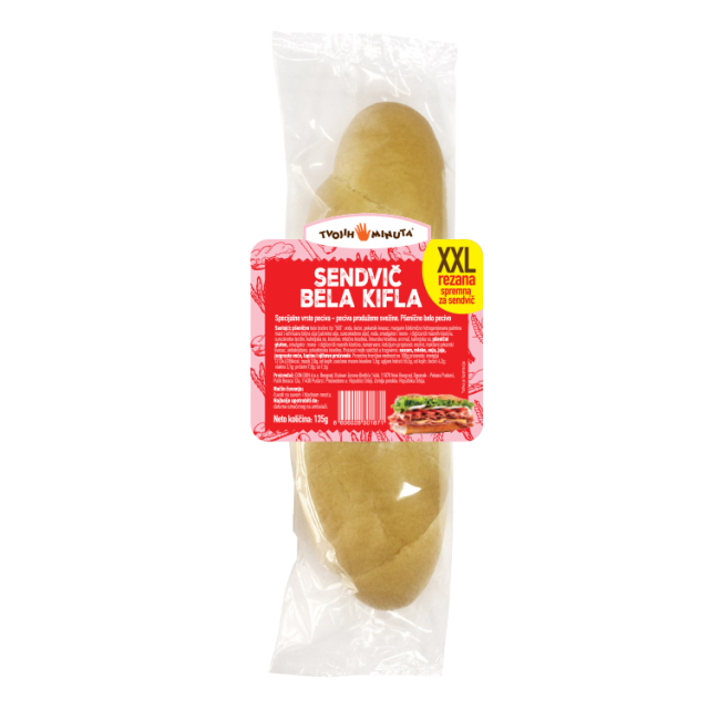 Sendvič bela kifla – 135g Nikada nije bilo lakše napraviti XXL sendvič! Tvojih 5 minuta XXL sendvič bela kifla, za XXL uživanje. Napravljena za sve one kojima u školi, na poslu ili dok putuju uvek fali zalogaj više. XXL zadovoljstvo od prvog do poslednjeg zalogaja!