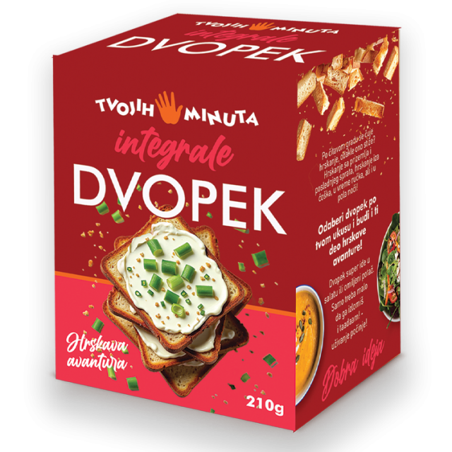 Dvopek Integrale – 210g Po čitavom gradu se čuje hrskanje, odakle ono stiže? Hrskanje sa prizemlja i poslednjeg sprata, hrskanje iza ćoška, u vreme ručka, ali i u pola noći! Odaberi dvopek po svom ukusu i budi i ti de hrskave avanture!