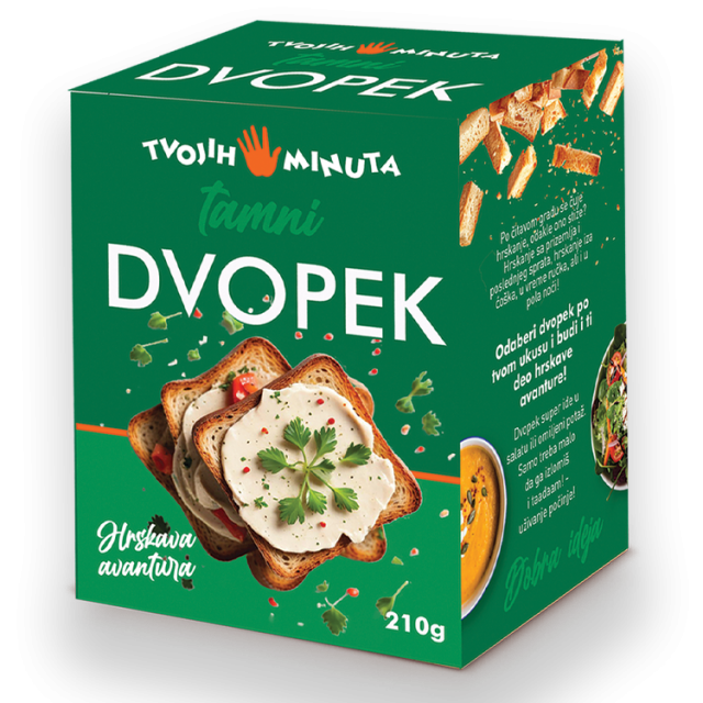 Dvopek Tamni – 210g Po čitavom gradu se čuje hrskanje, odakle ono stiže? Hrskanje sa prizemlja i poslednjeg sprata, hrskanje iza ćoška, u vreme ručka, ali i u pola noći! Odaberi dvopek po svom ukusu i budi i ti deo hrskave avanture!